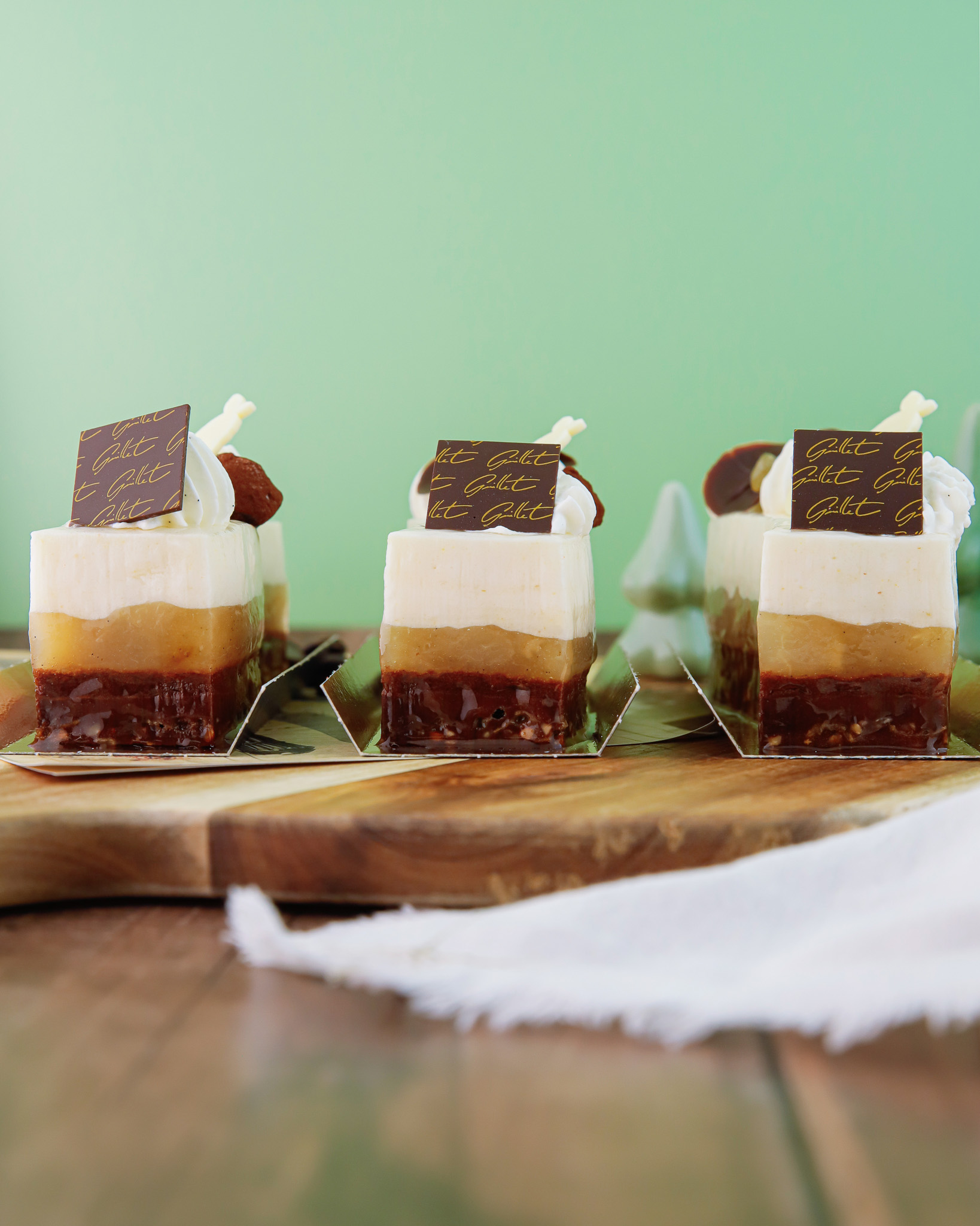 Un crémeux caramel-chocolat, posé sur un biscuit chocolat sans farine.