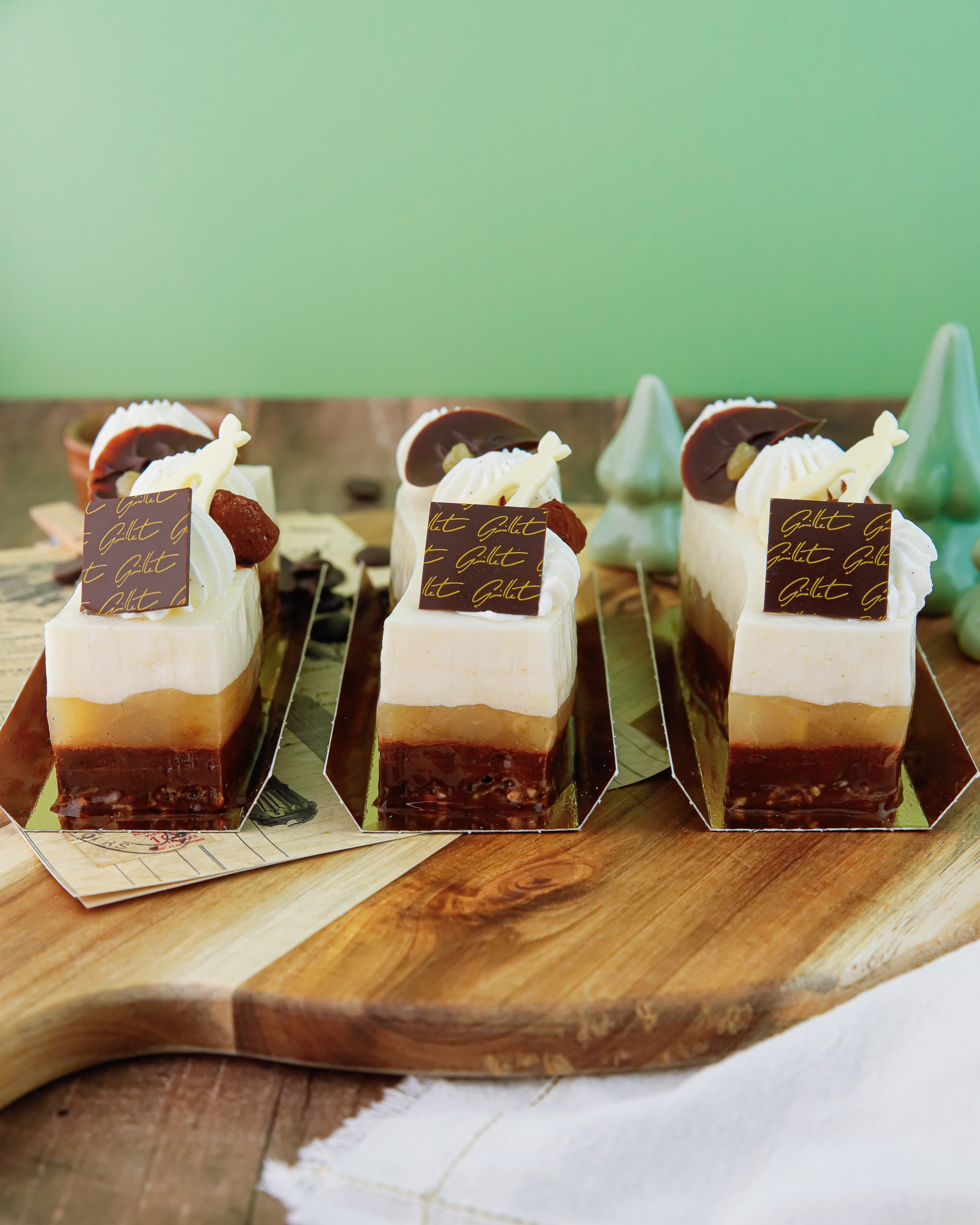 Création fruitée et élégante mêlant douceur de la poire et intensité du chocolat.