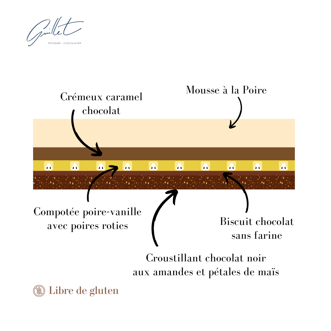 La dégustation commence par une mousse à la poire, aérienne et parfumée, sublimée par une compotée poire-vanille et des poires rôties fondantes. Elle révèle ensuite un crémeux caramel-chocolat, riche et onctueux, reposant sur un biscuit chocolat sans farine, à la fois léger et intense en cacao. L’ensemble est souligné par un croustillant chocolat noir, aux amandes croquantes et pétales de maïs, pour un final texturé et irrésistible.