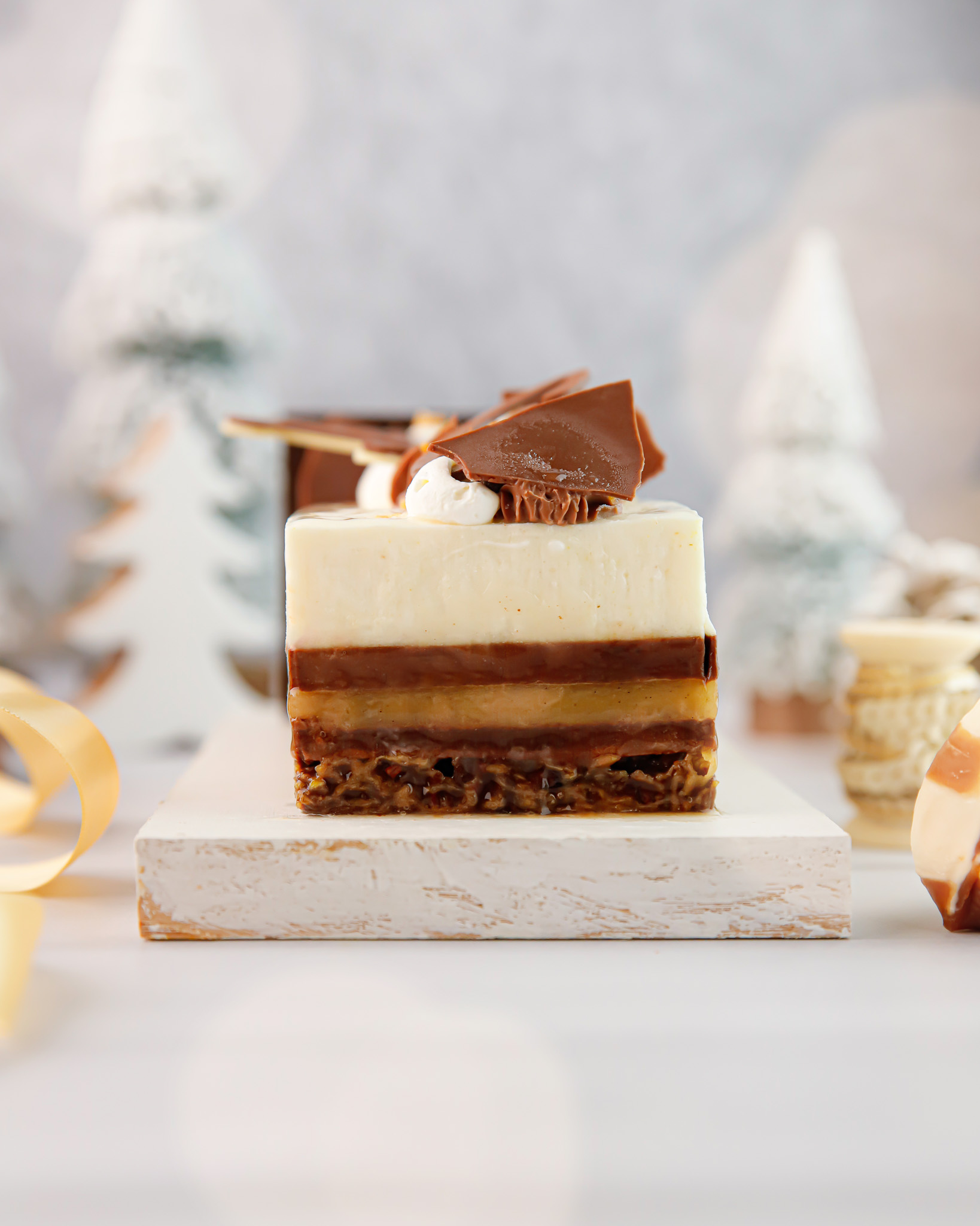 Un crémeux caramel-chocolat, posé sur un biscuit chocolat sans farine.