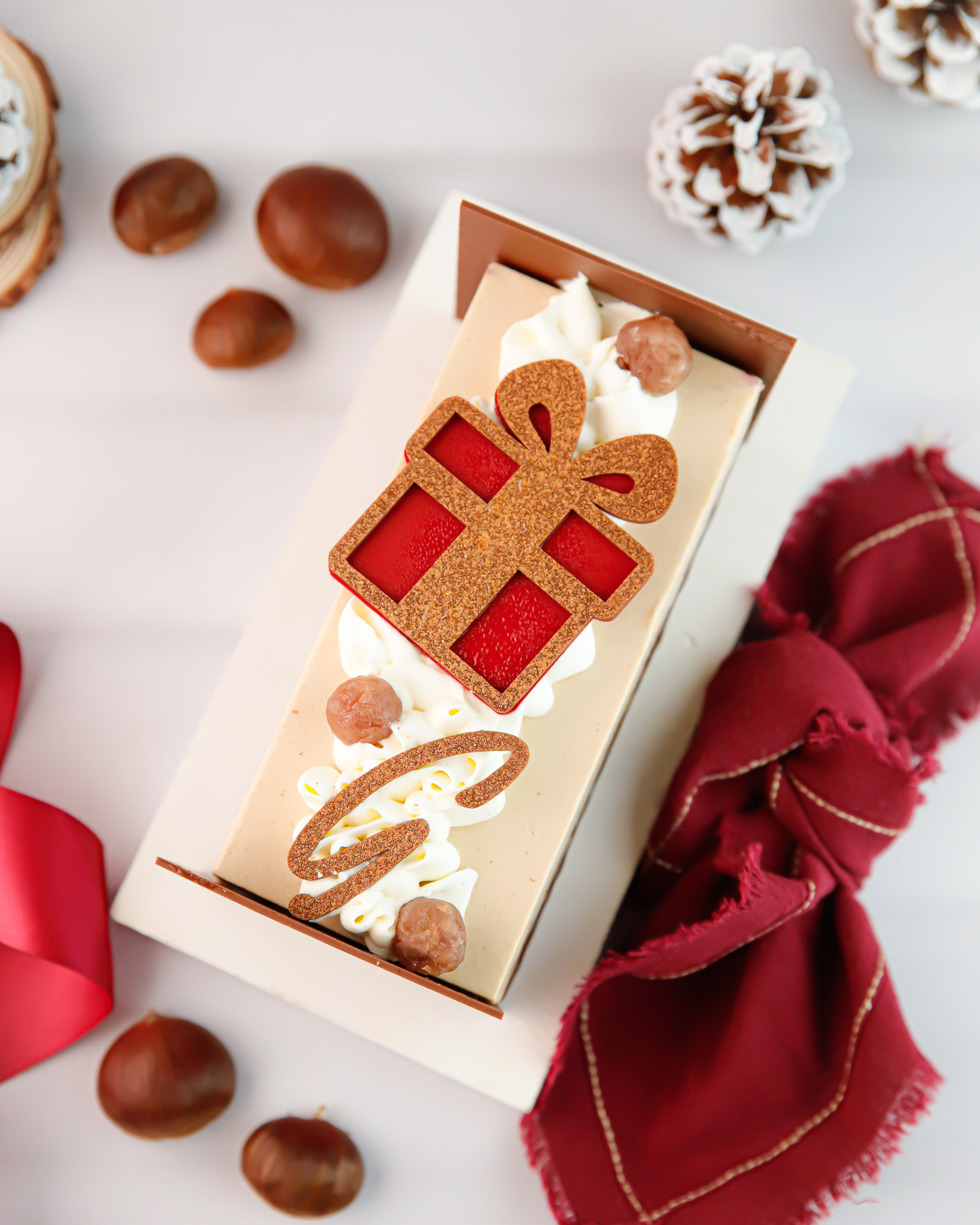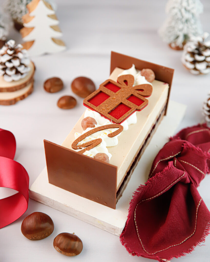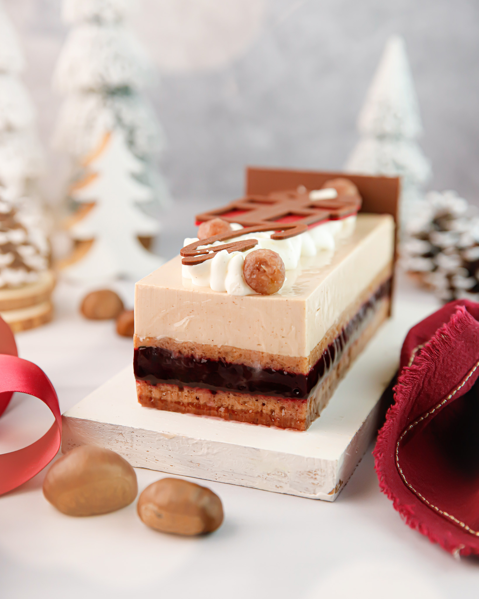Sa mousse légère au marron dévoile une compotée cassis–myrtille acidulée, reposant sur un biscuit moelleux à la châtaigne. Le tout est soutenu par un croustillant au marron enrichi de crumble et ponctué de brisures croquantes, pour une dégustation tout en textures.