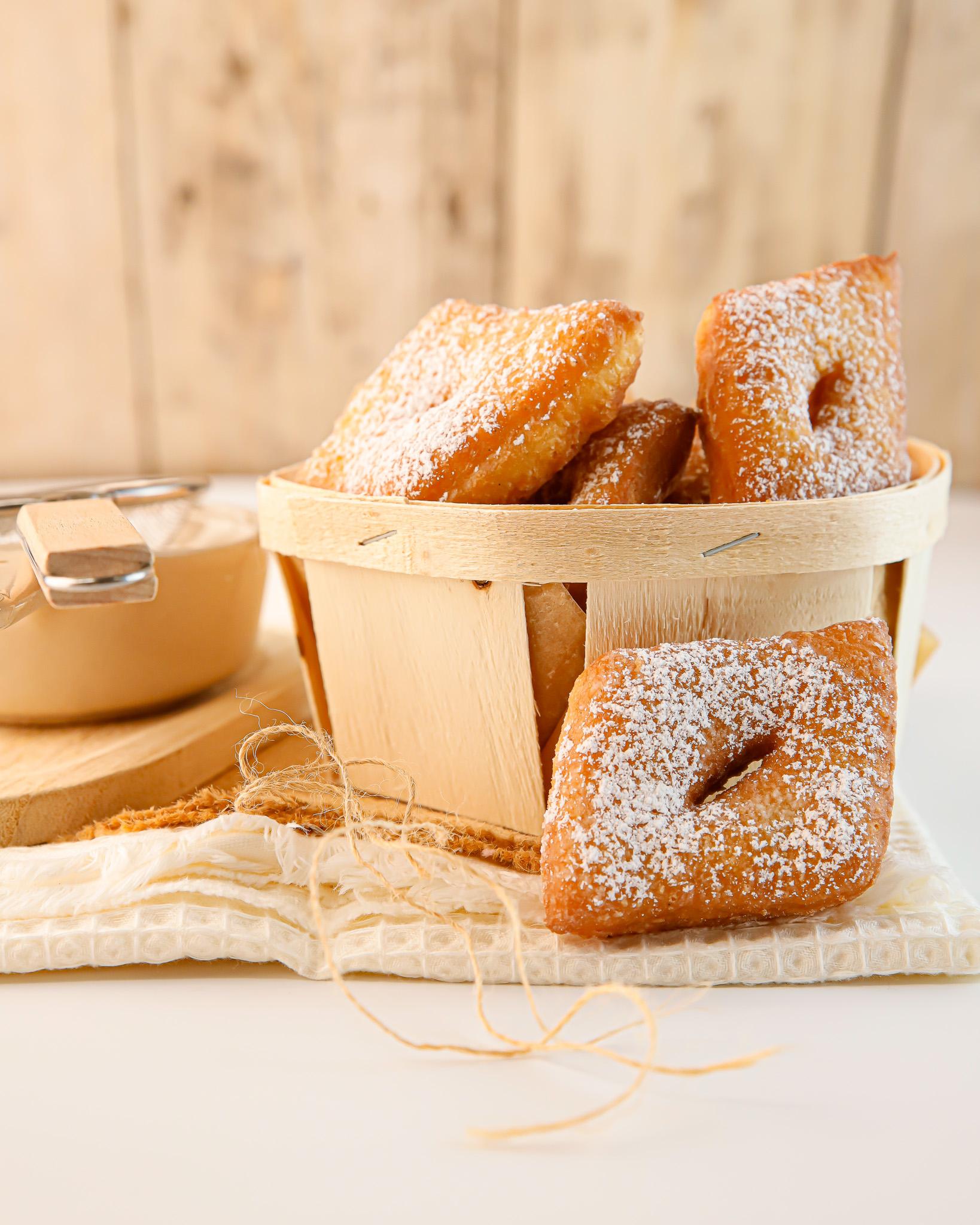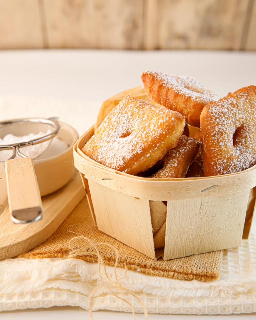 Des bugnes maison moelleuses et fondantes parsemées de sucre glace.