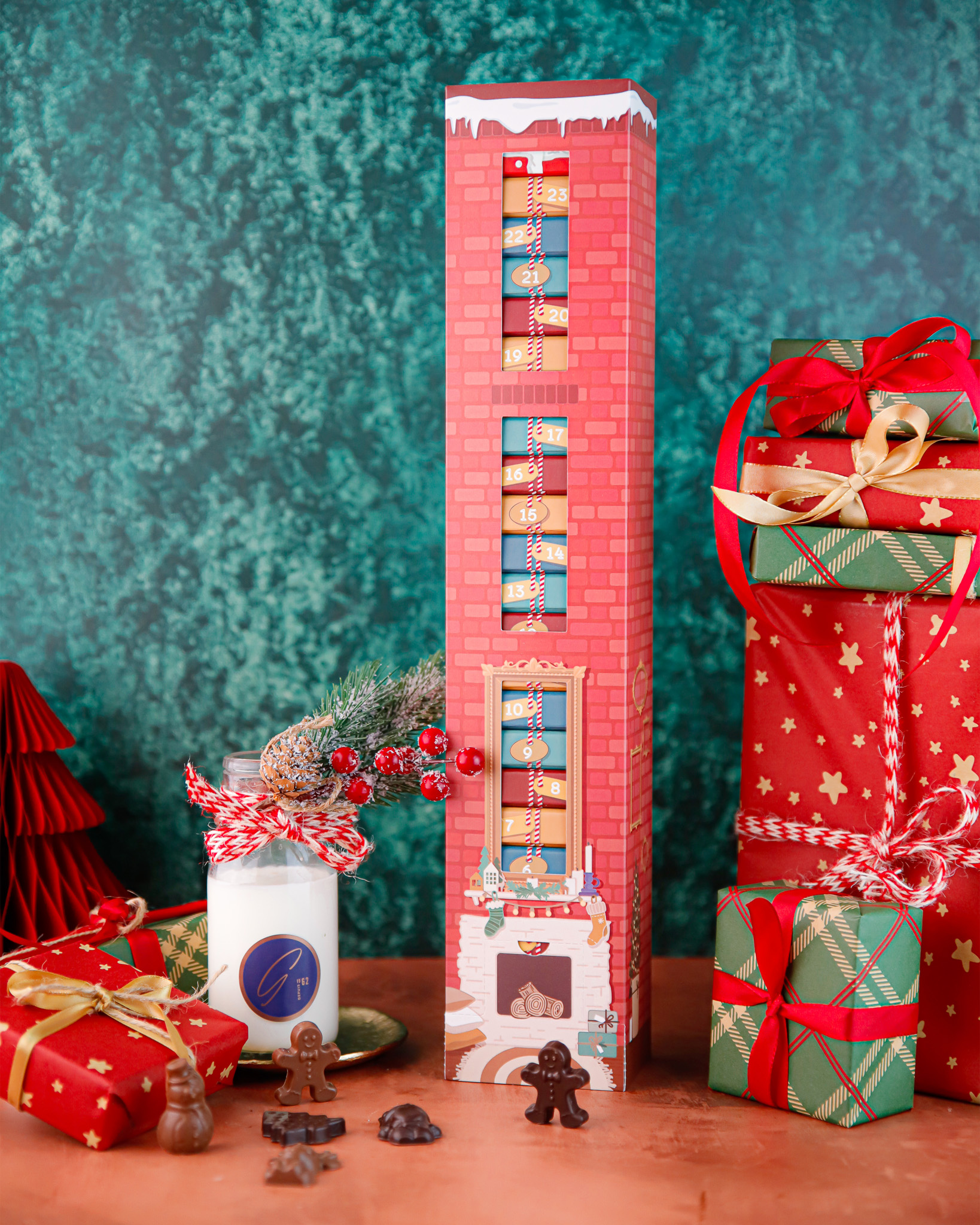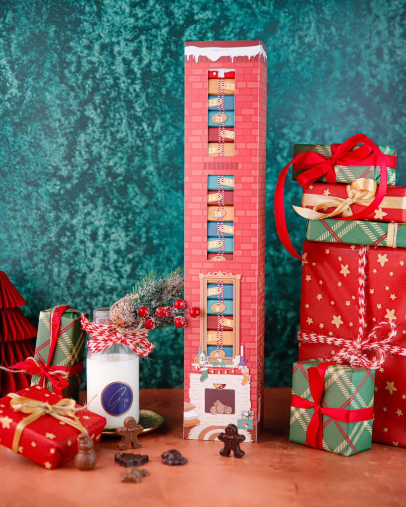 Un calendrier original en forme de cheminée où les cadeaux descendent jour après jour jusqu’à Noël, garnis de chocolats et douceurs artisanales.