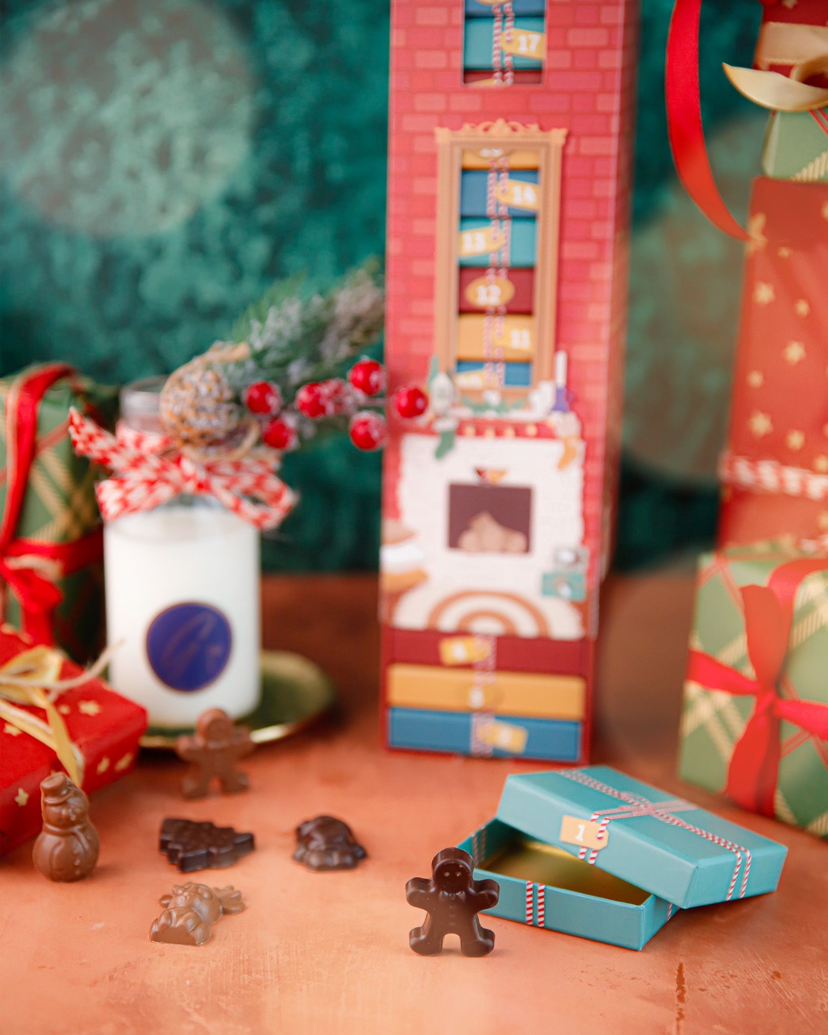 Sous la forme d’une haute cheminée rouge, chaque petite boîte libère une douceur chocolatée qui descend jour après jour, comme si les cadeaux glissaient lentement vers le feu de la cheminée.