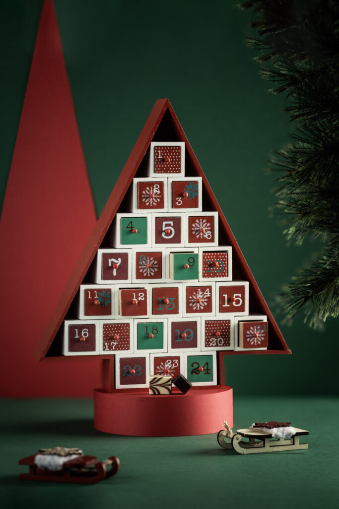 Un calendrier en bois en forme de sapin, garni de douceurs chocolatées dans de jolis tiroirs à ouvrir chaque jour jusqu’à Noël.