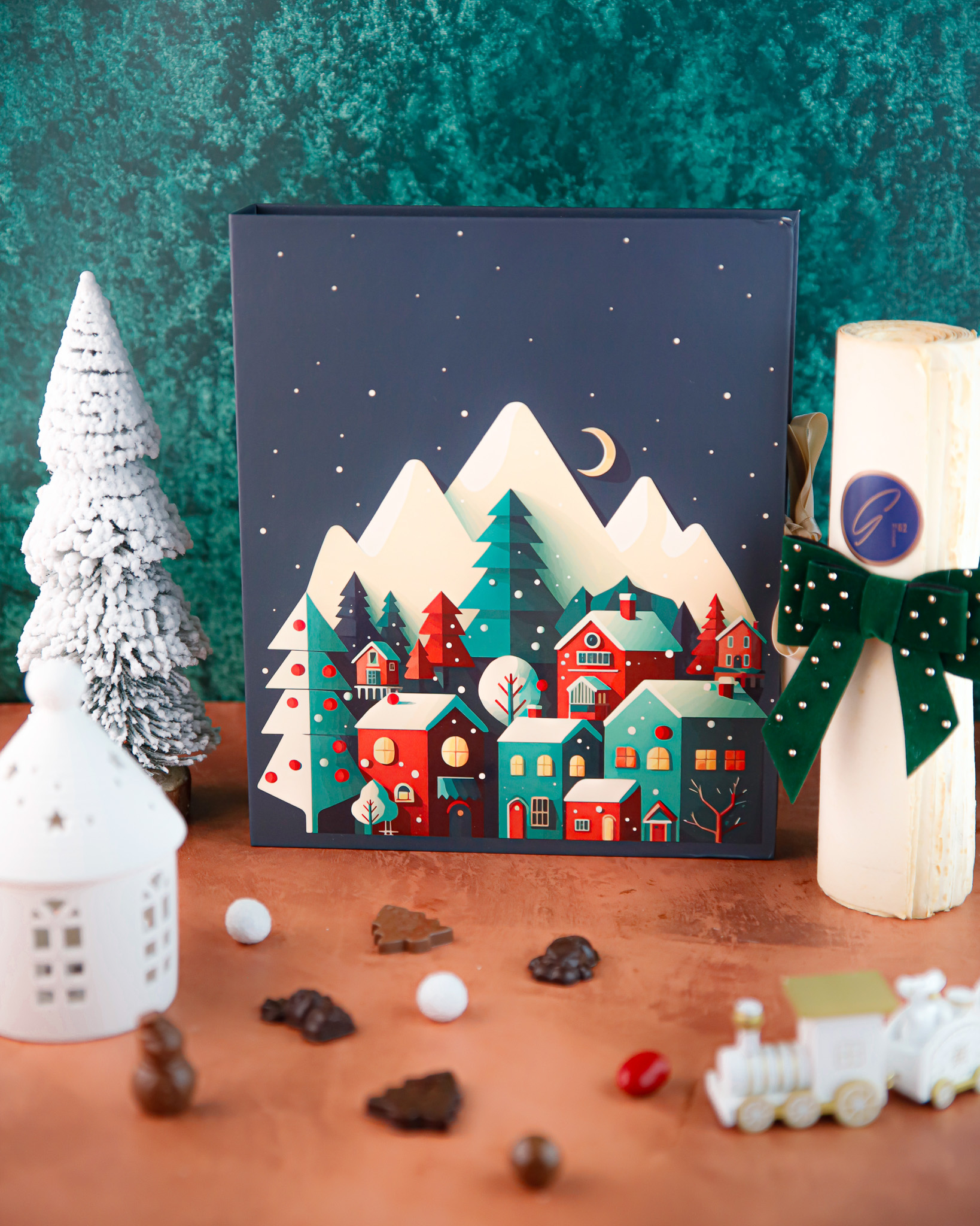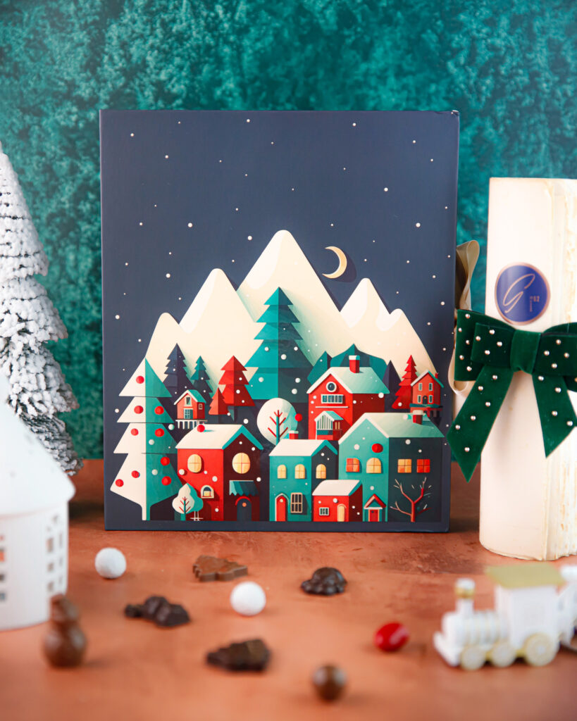 Inspiré d’un village enneigé, ce calendrier allie la beauté d’un objet de fête à la générosité d’une sélection chocolatée d’exception.