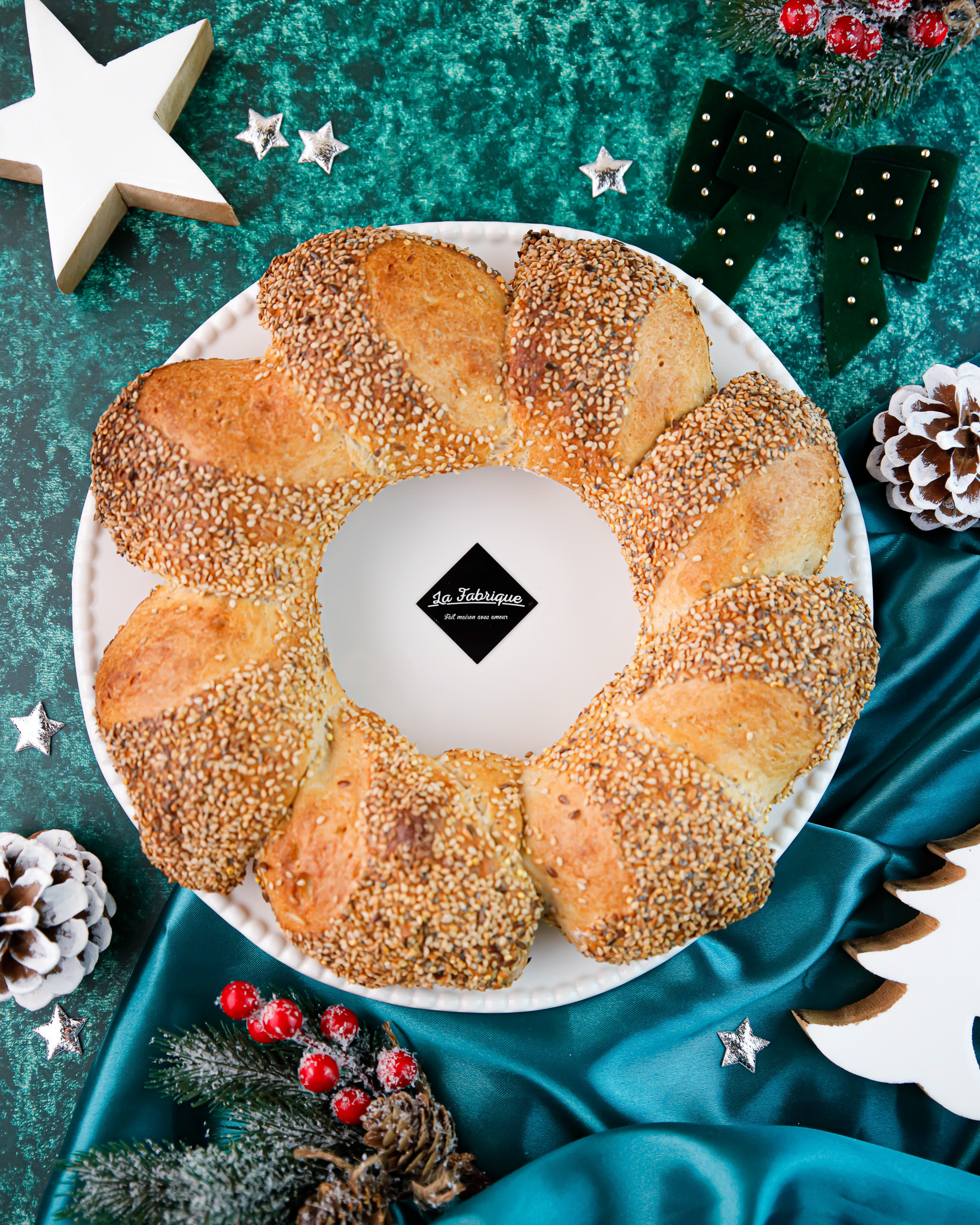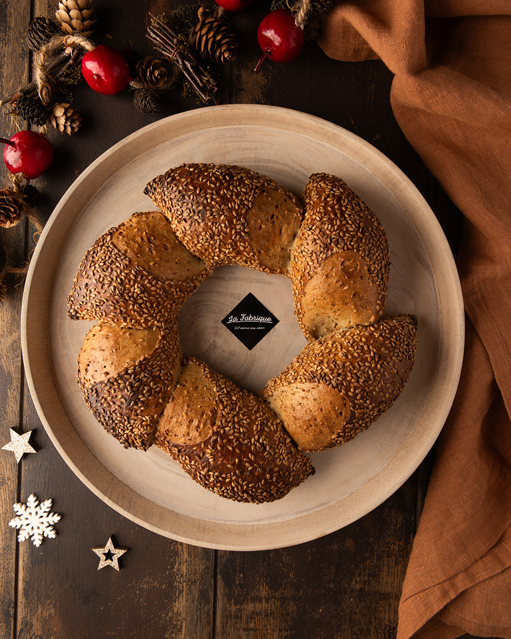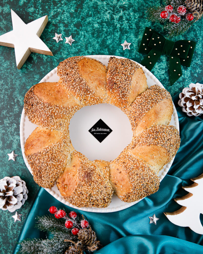 Un pain couronne artisanal, riche en céréales et généreusement parsemé de graines de sésame pour une saveur rustique et authentique.