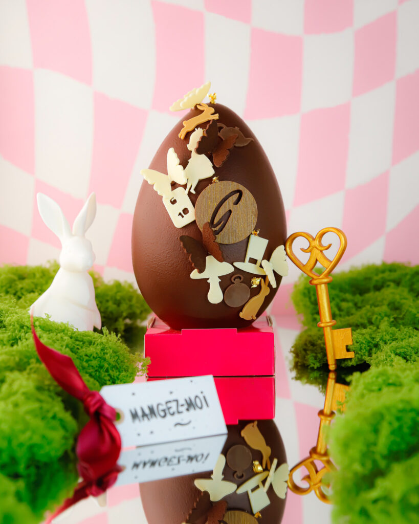 Réalisé en chocolat artisanal, cet œuf généreux se pare de décors inspirés du célèbre conte : lapin, papillons, chapeau du chapelier et symboles fantastiques, comme autant d’indices d’un voyage gourmand au cœur du pays des merveilles.