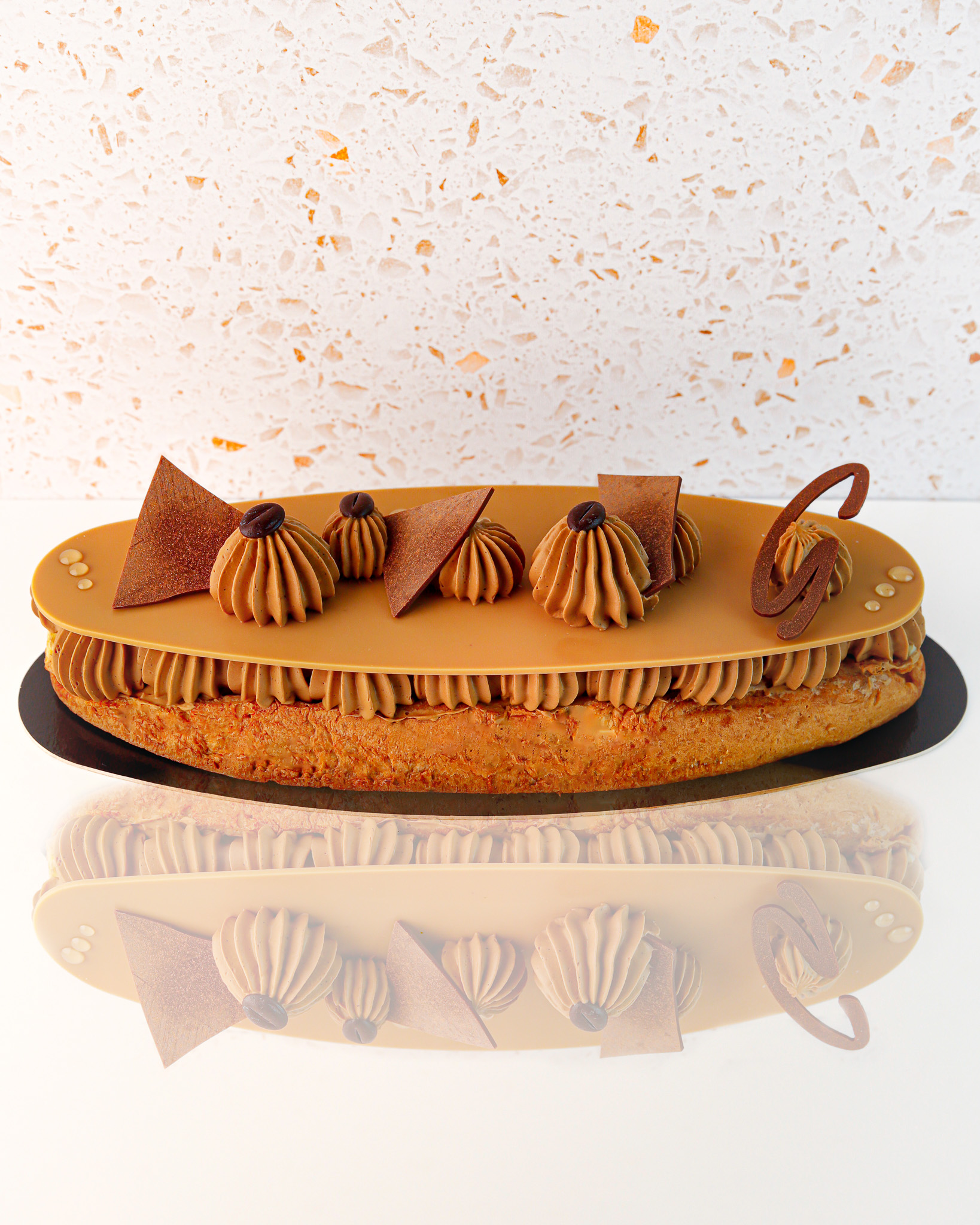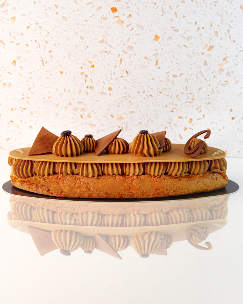 Sous sa fine pâte à choux maison, se cache une crème au café onctueuse et parfumée, recouverte d’un glaçage brillantqui souligne l’intensité du café.