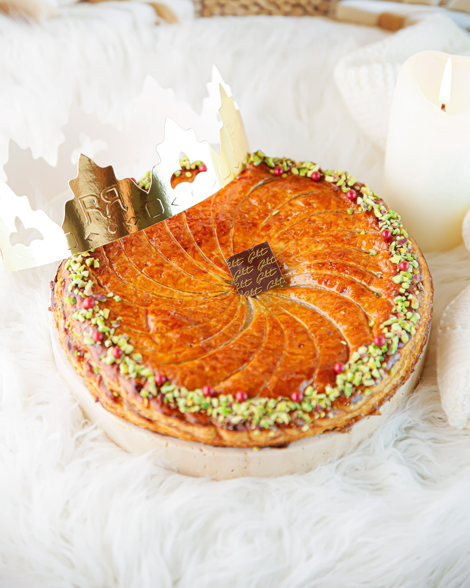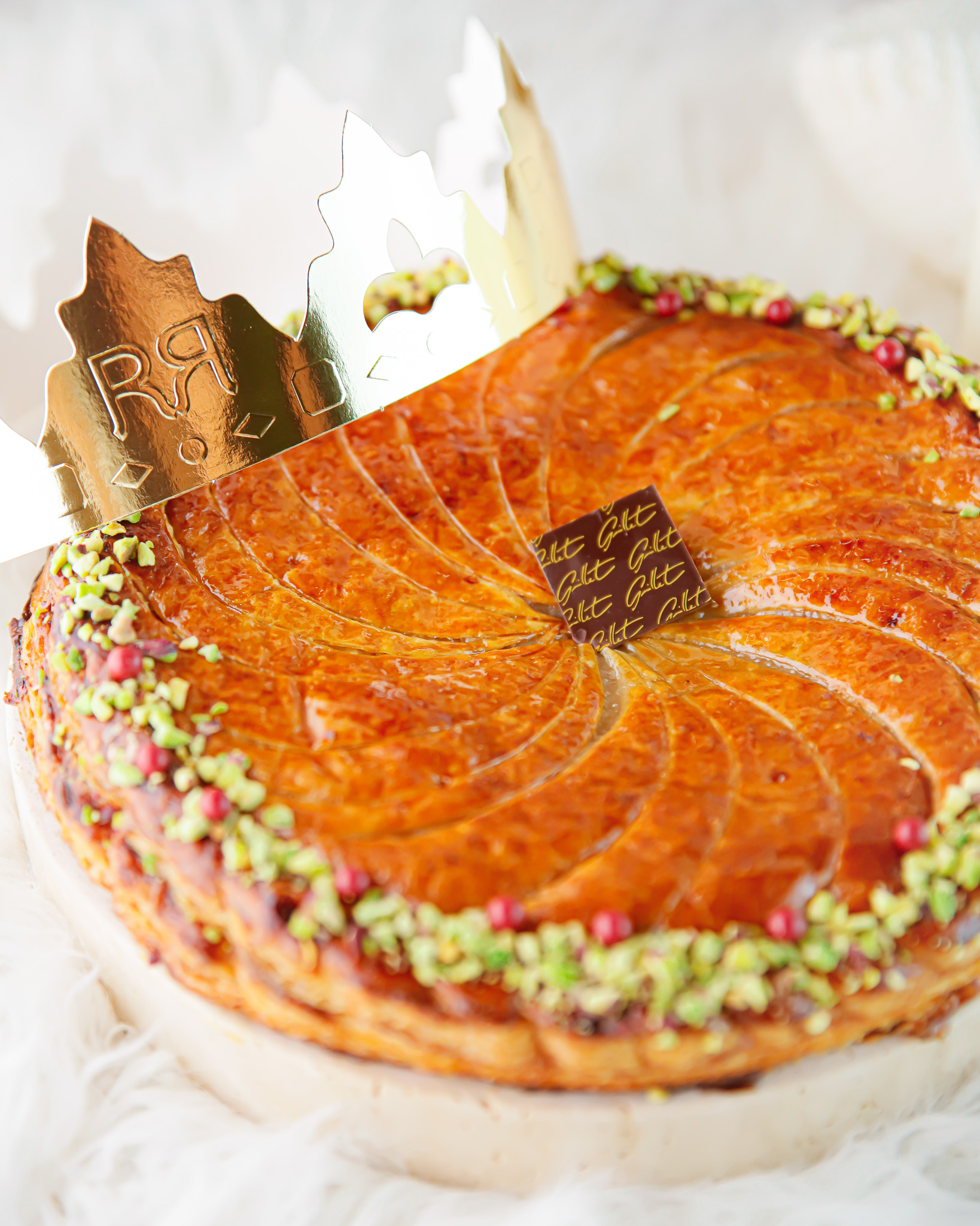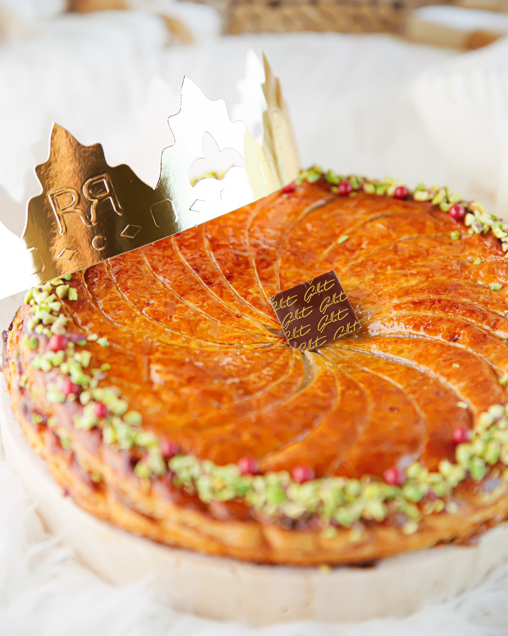 Sous un feuilletage pur beurre travaillé artisanalement, doré et croustillant, se dévoile une frangipane pistache onctueuse, subtilement parfumée et généreuse.