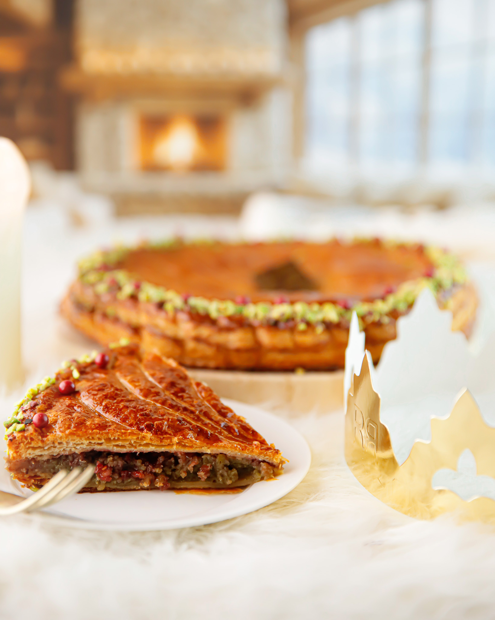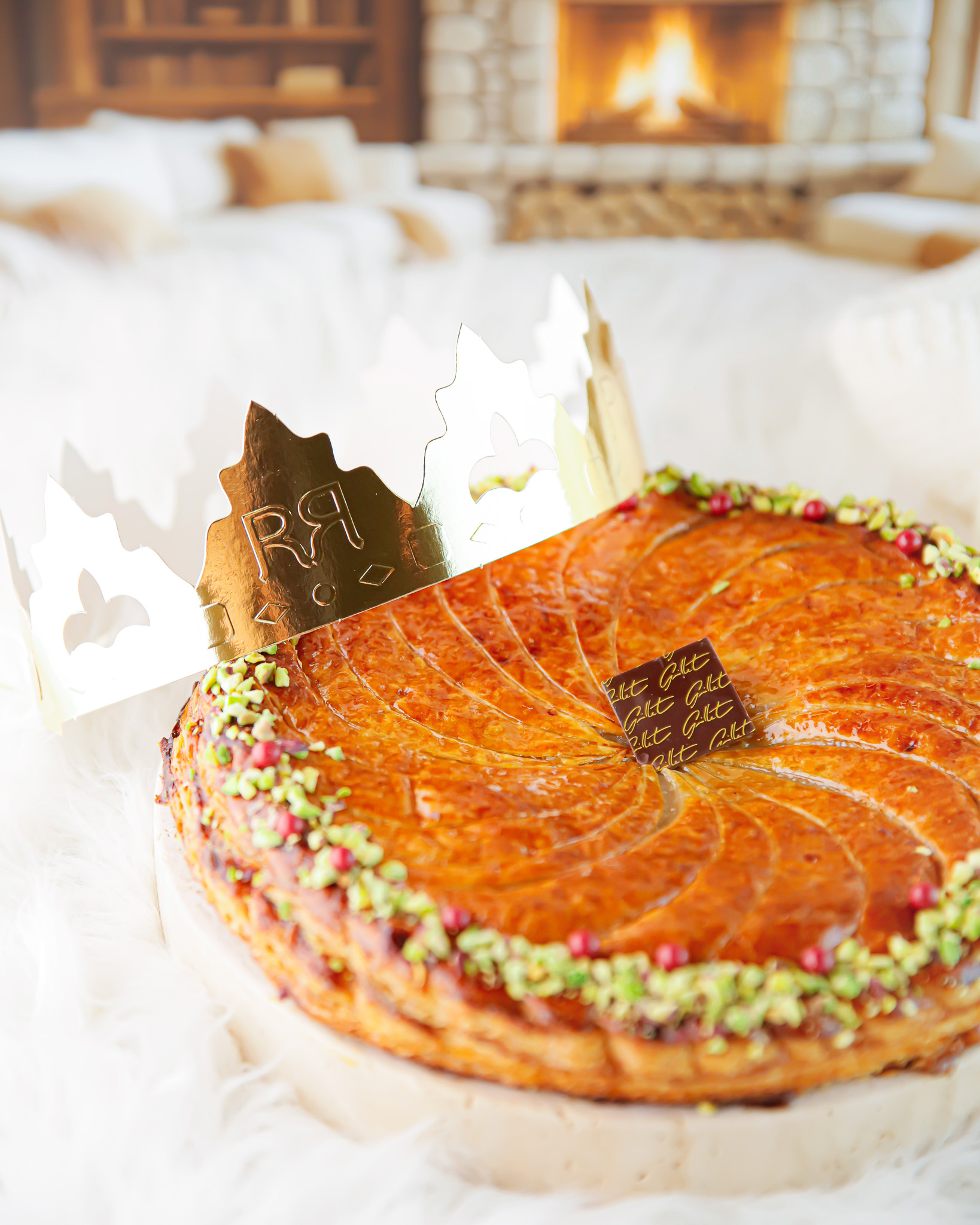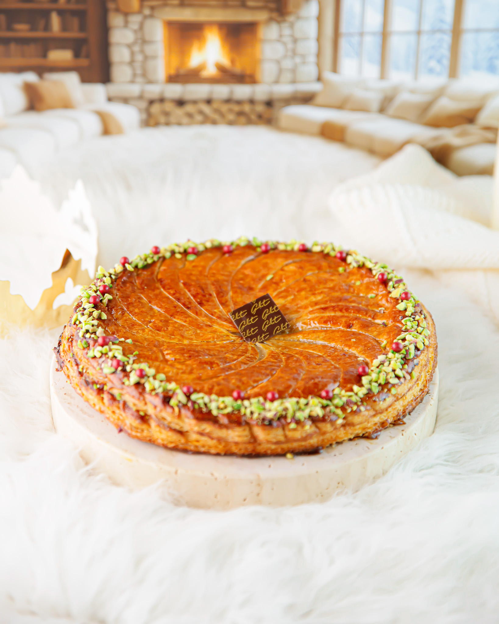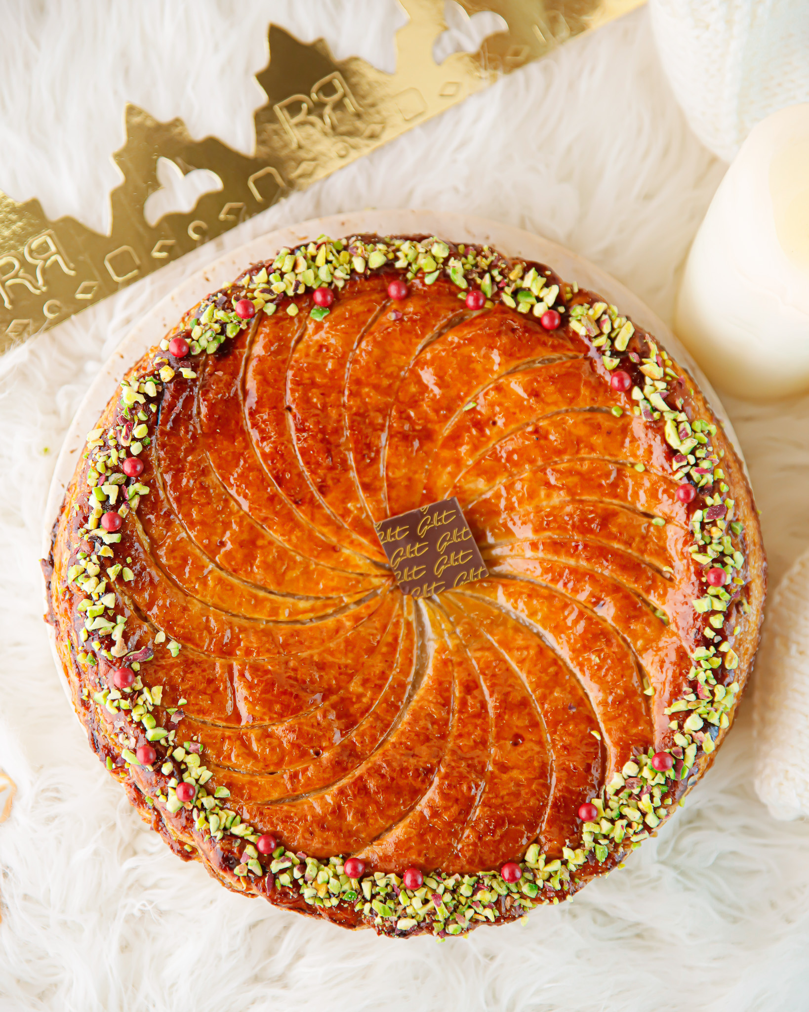 Sous un feuilletage pur beurre travaillé artisanalement, doré et croustillant, se dévoile une frangipane pistache onctueuse, subtilement parfumée et généreuse.