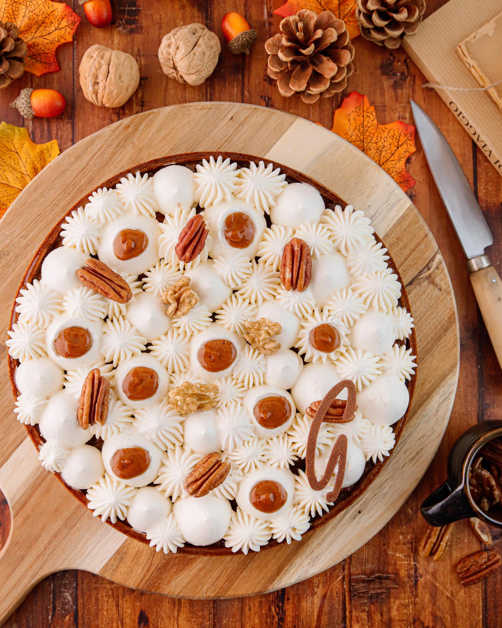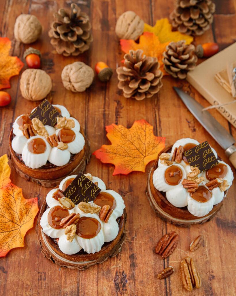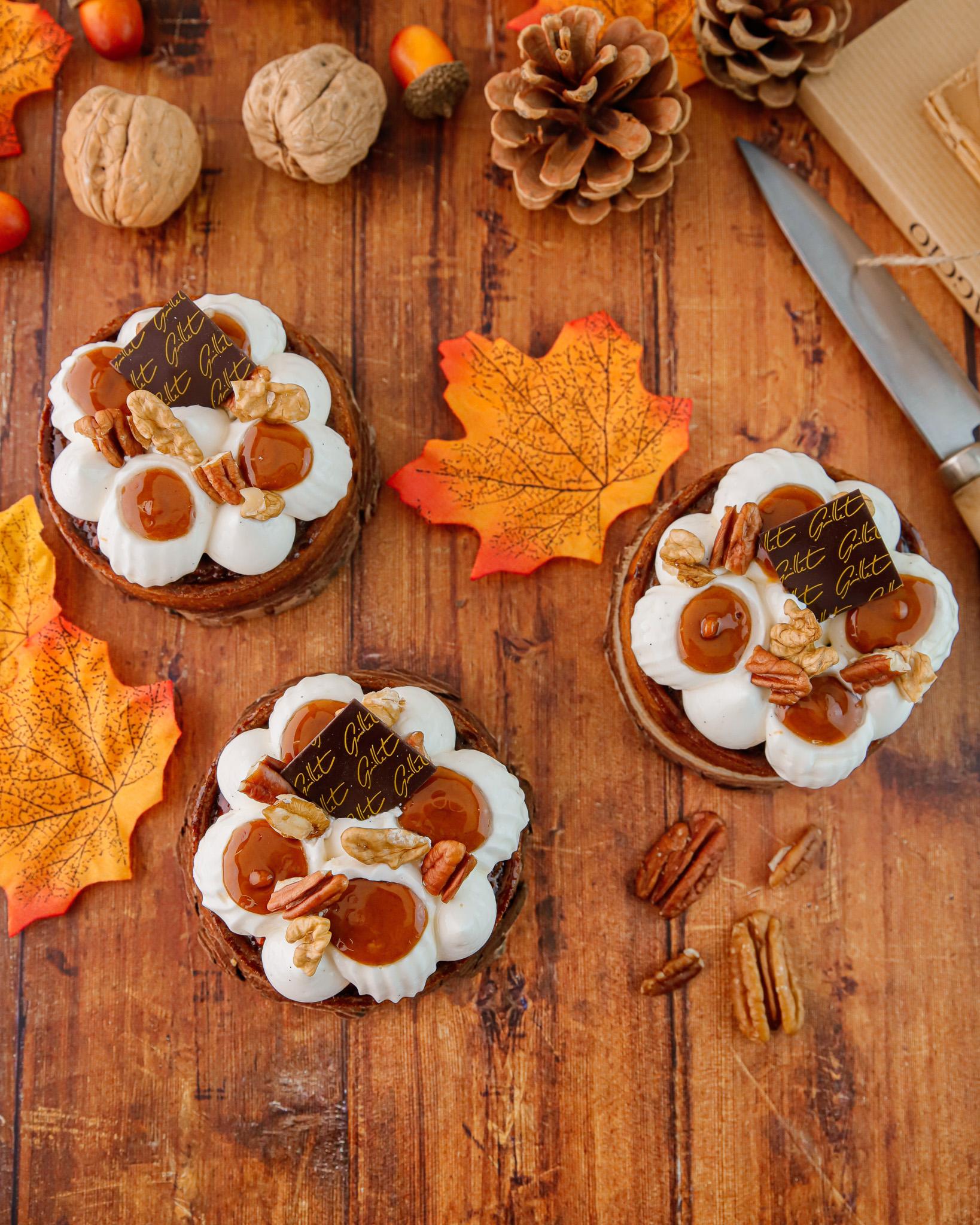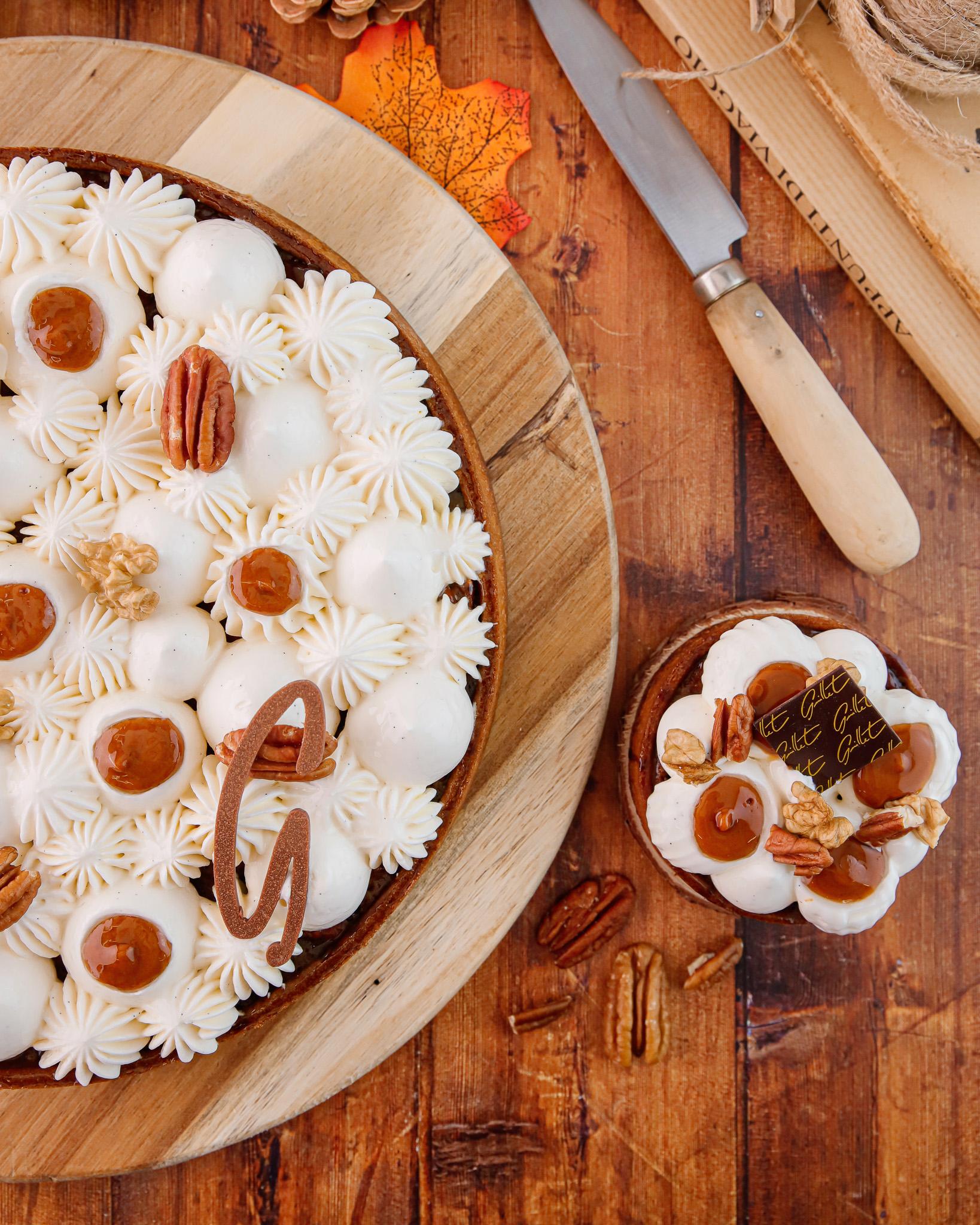 Notre tarte mêlant la douceur de la vanille, la richesse du caramel, et le croquant des noix de pécan et noix du Royans, qui incarnent l’essence même de cette saison magique.