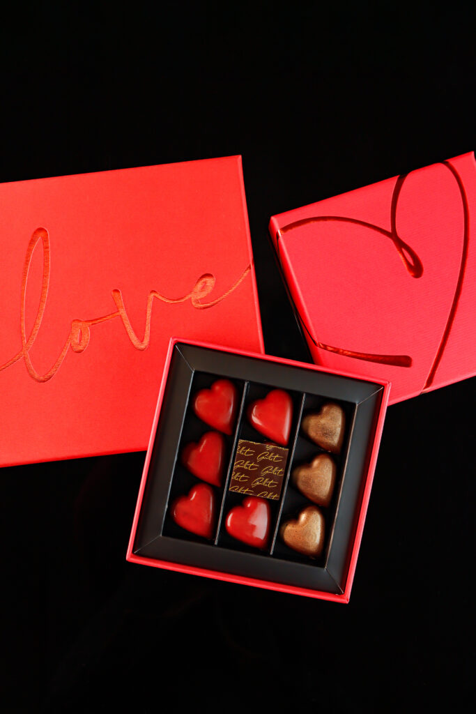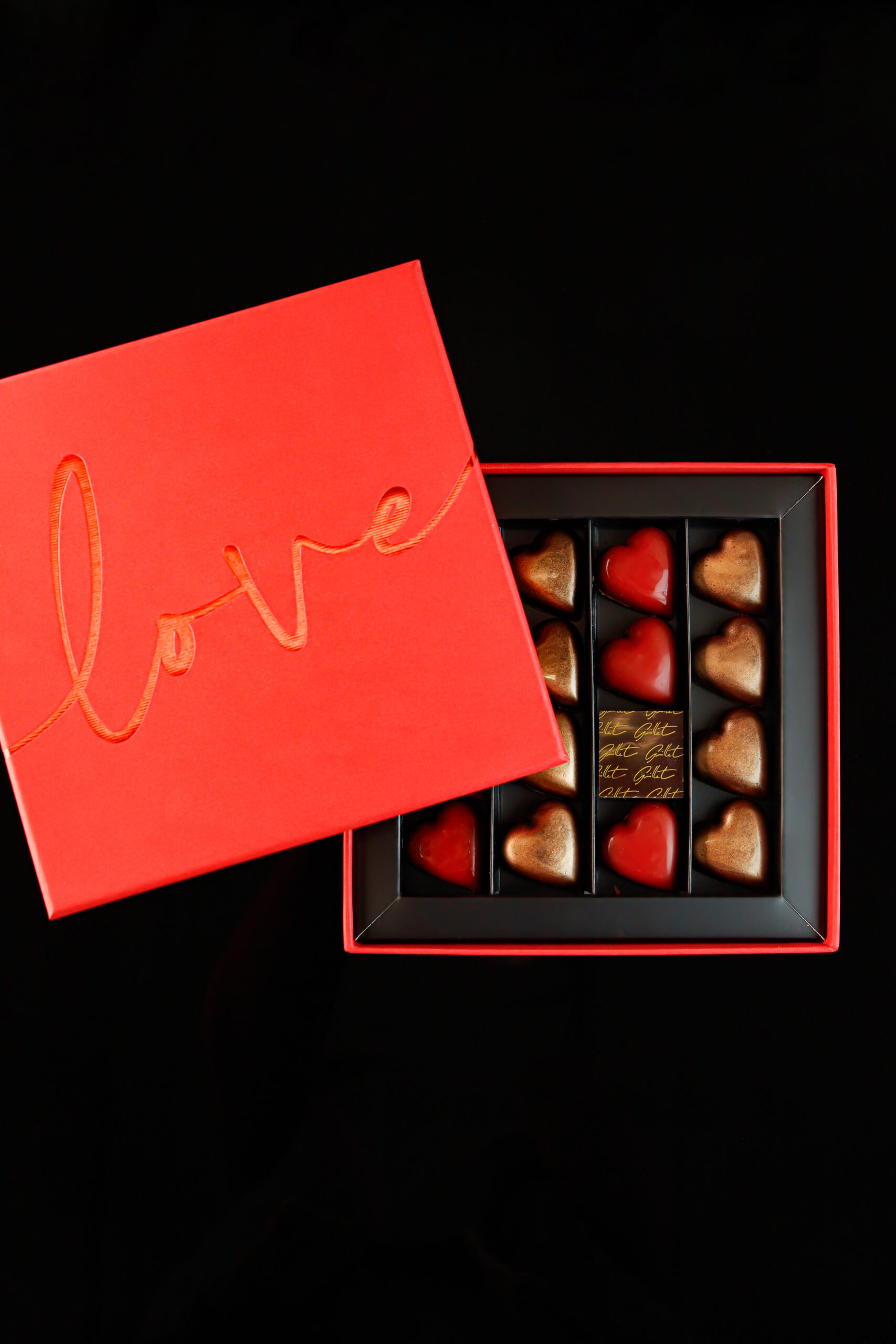 Coffret de coeurs en chocolat noir garnis d’un praliné à l’ancienne et coeurs cuivrés, ganache caramel vanillée.