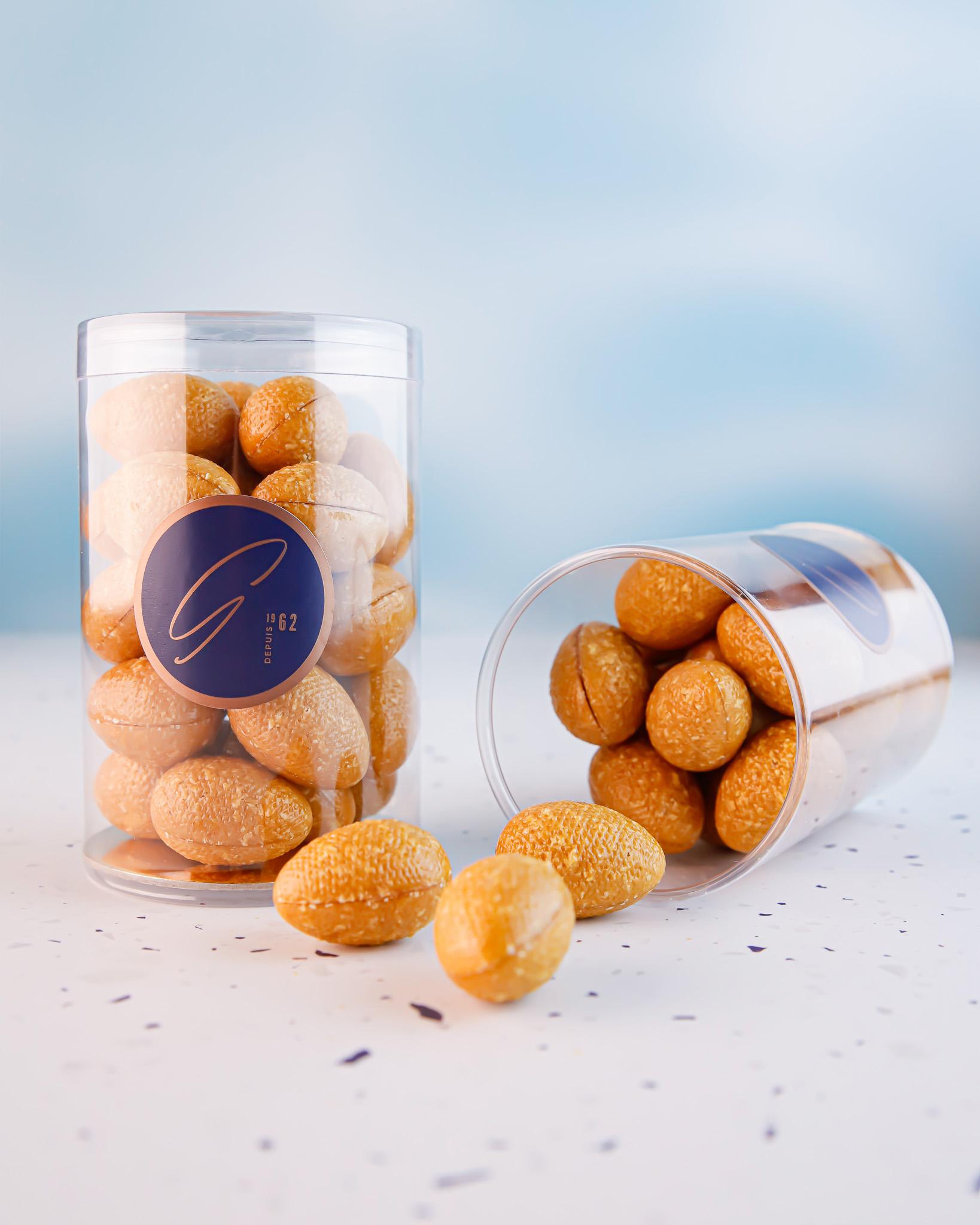 Oeufs en coque de nougatine, garni de notre délicieux praliné à l’ancienne. Craquants et fondants à la fois, vous les trouverez irrésistibles !