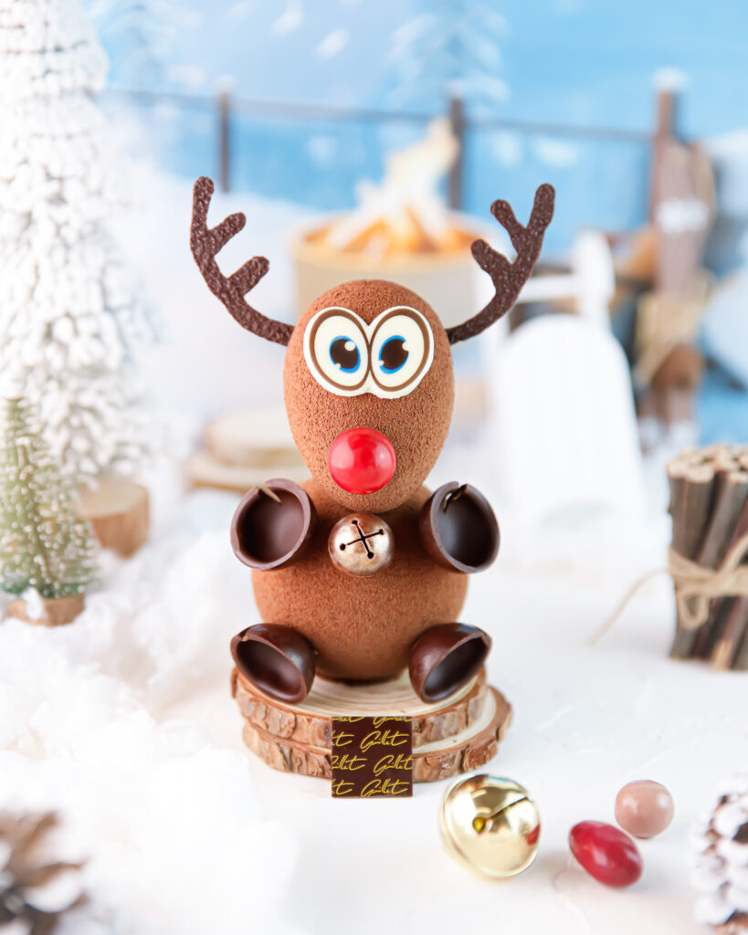 Symbole joyeux des fêtes, Rudolph le Renne se décline chez la Maison Guillet en une création en chocolat noir artisanal, élégante et gourmande.