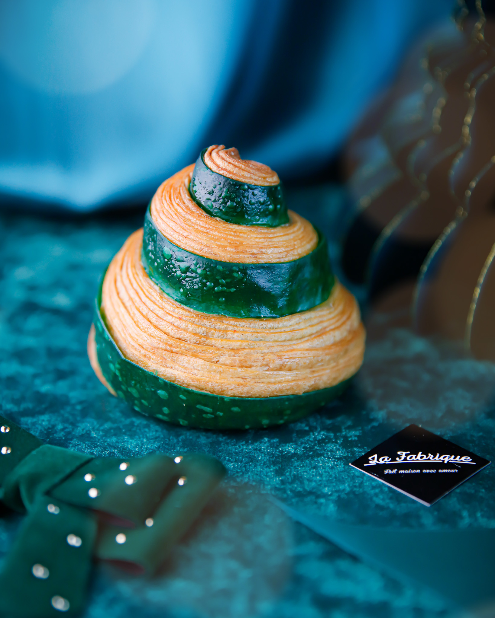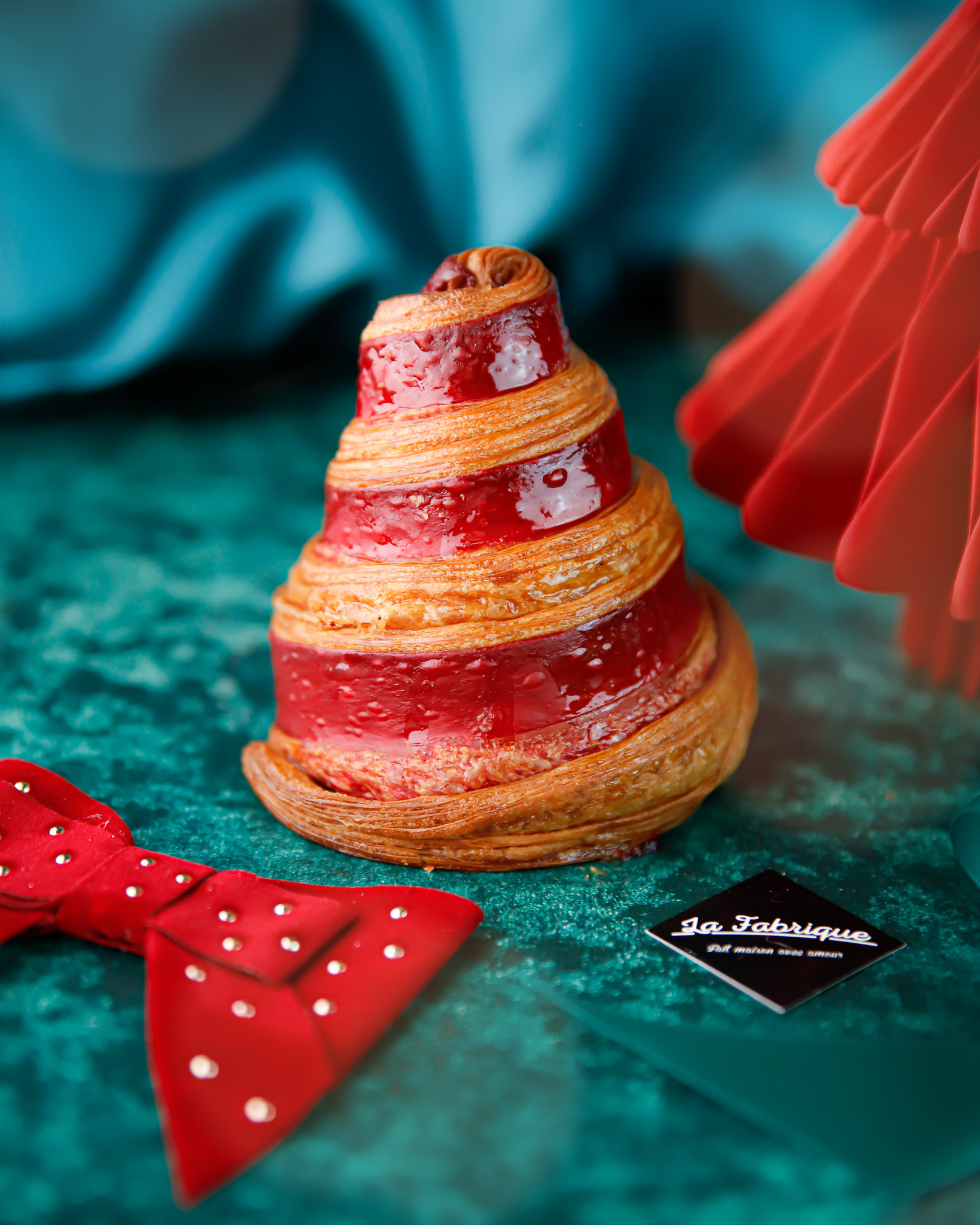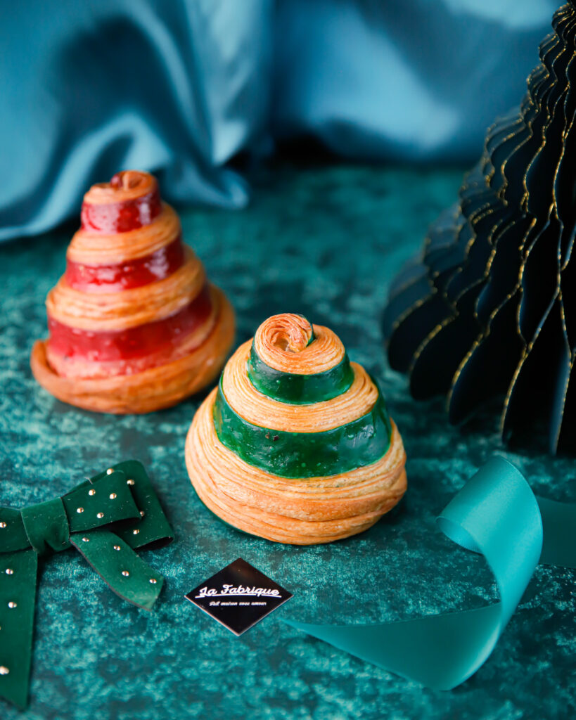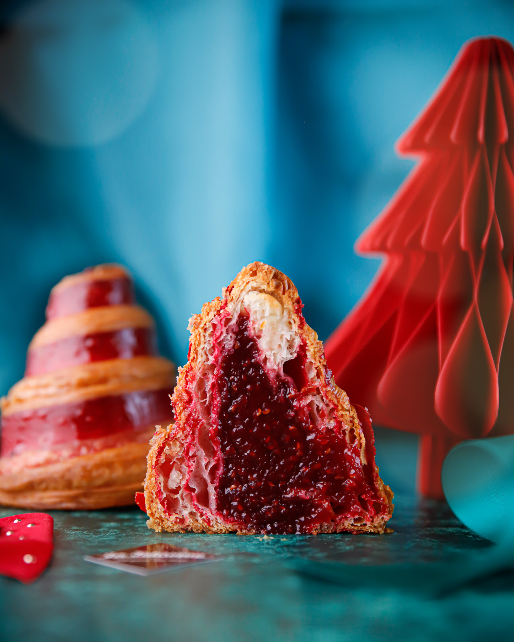 Un croissant feuilleté en forme de sapin, garni de framboise ou de pistache.