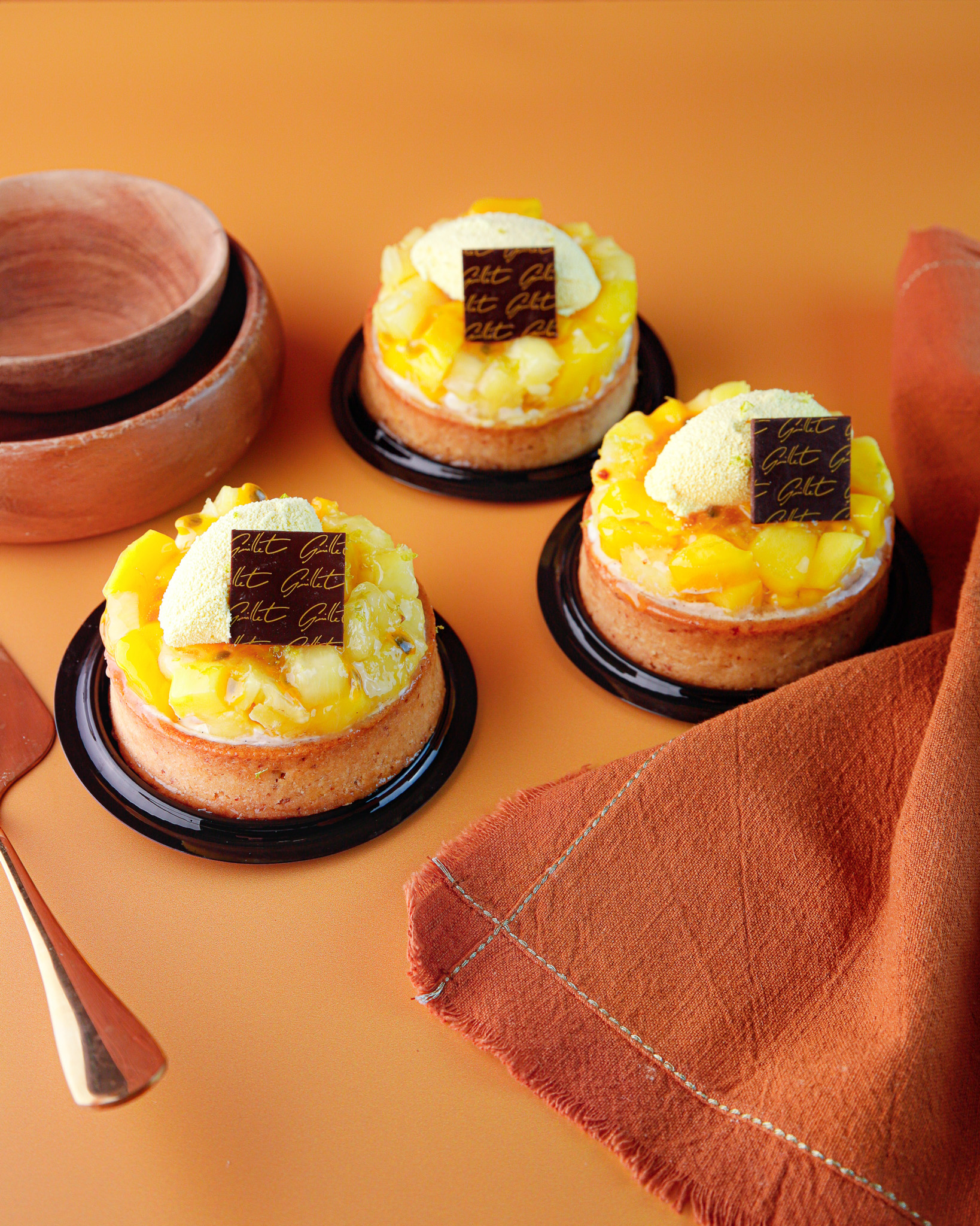 Au fond, une pâte sucrée croustillante accueille une marmelade exotique riche en saveurs. Vient ensuite une mousse aérienne à la mangue et au fruit de la passion, délicate et intensément fruitée.