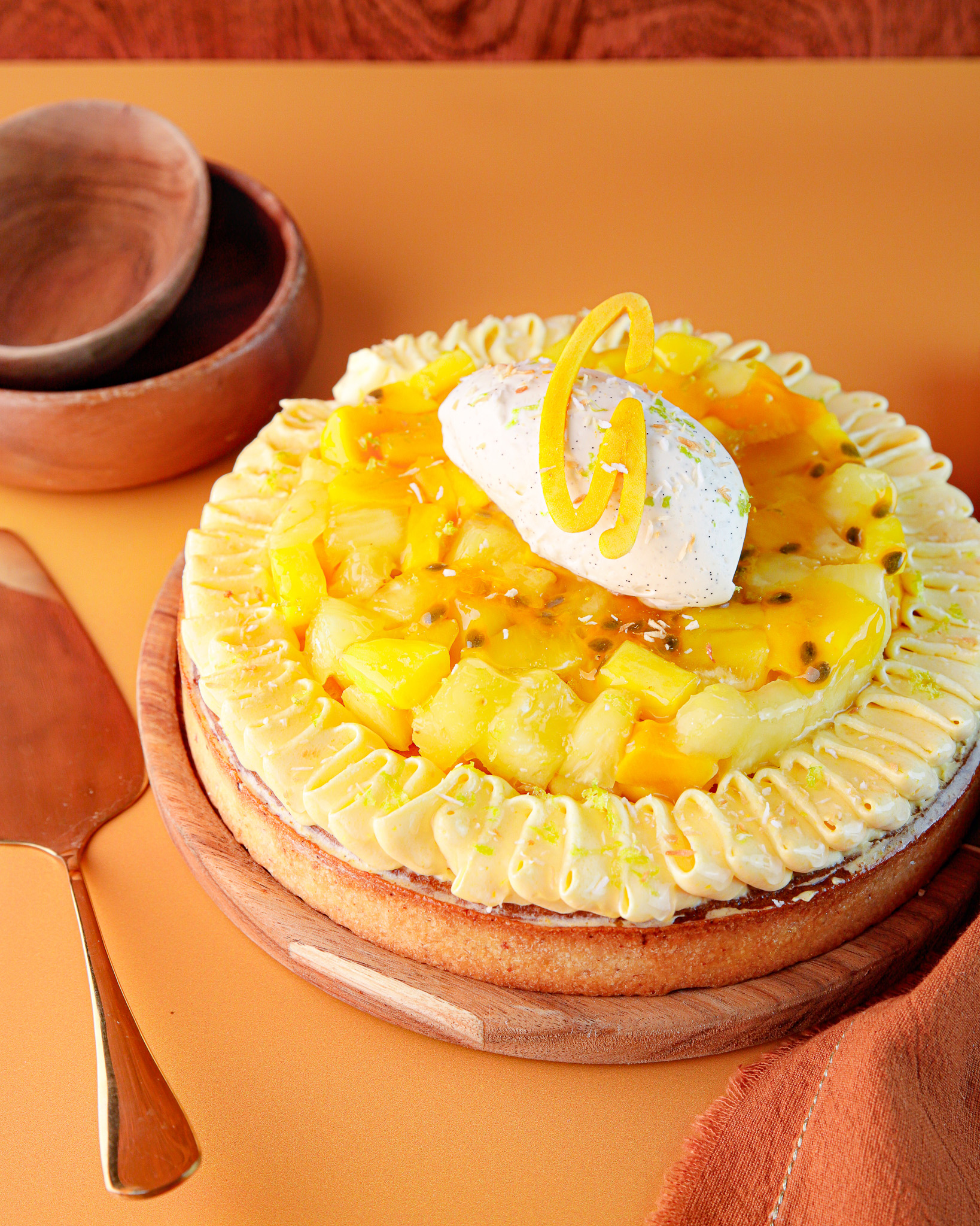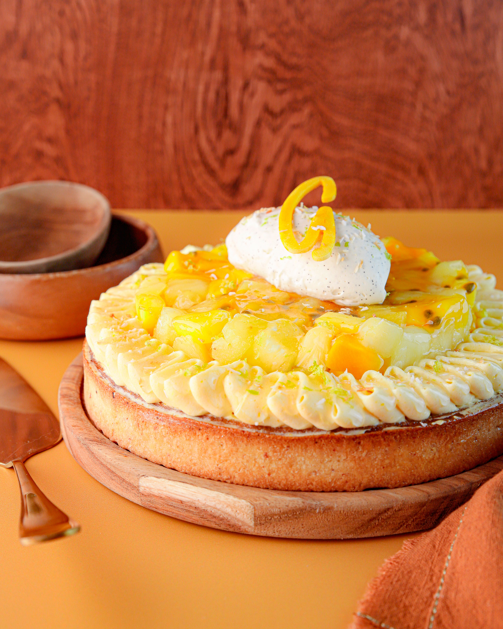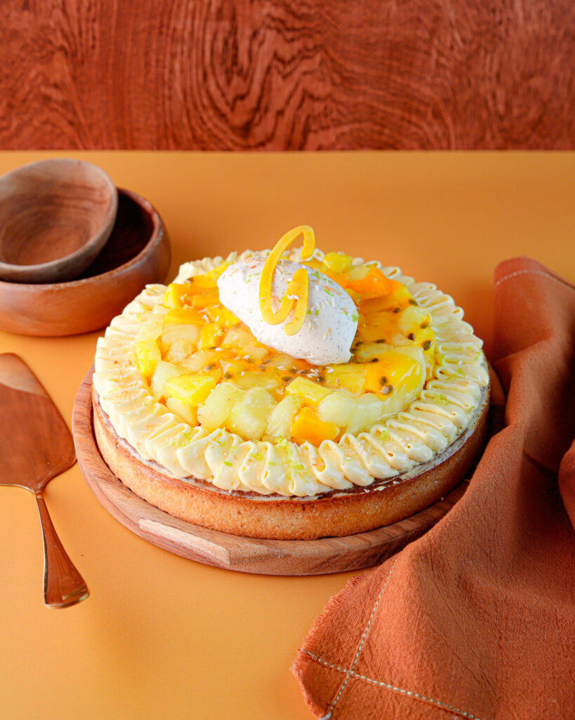 Une tarte lumineuse aux saveurs exotiques : mousse mangue–passion, marmelade fruitée et croustillant passion-coco, sublimés par des dés d’ananas et de mangue.