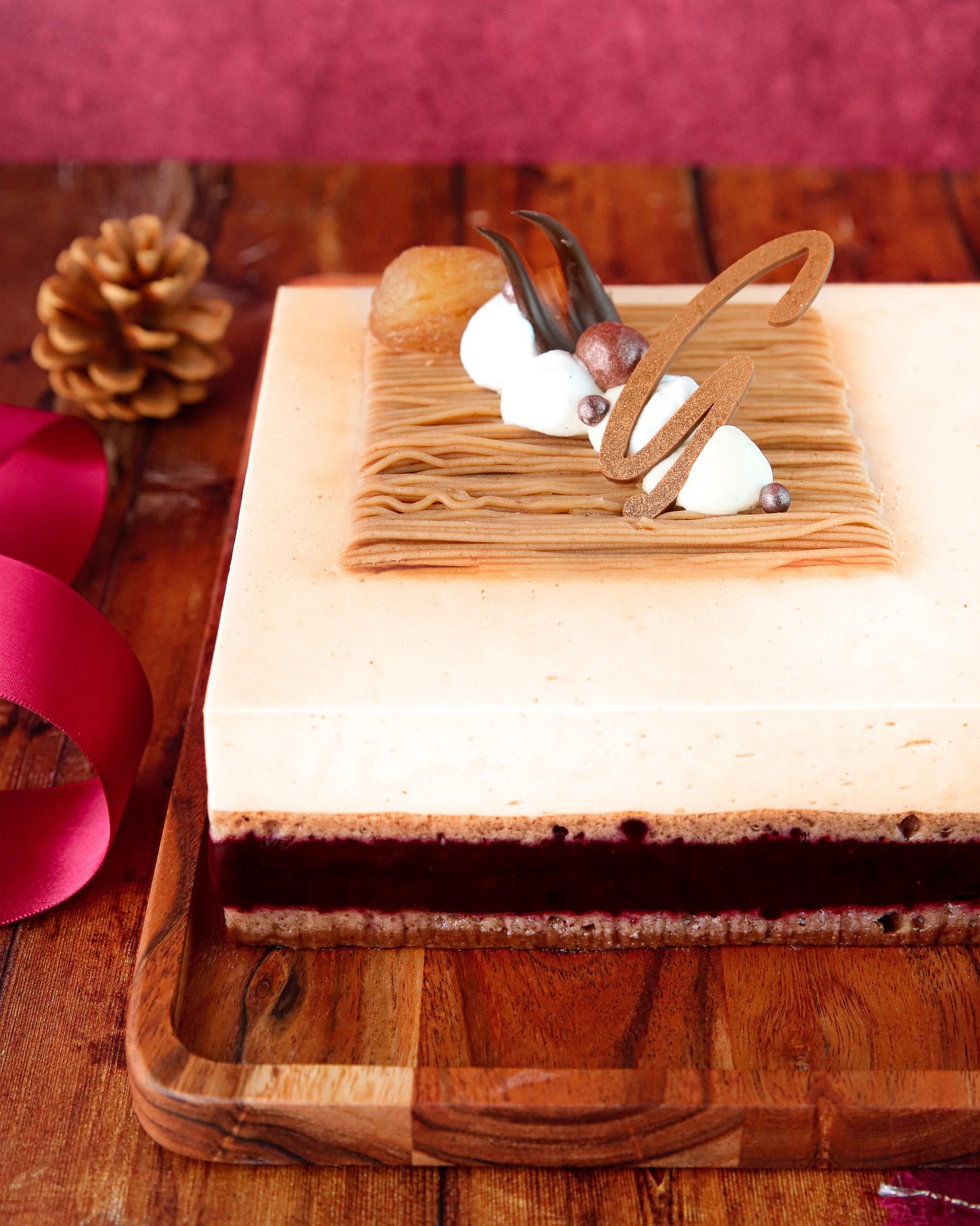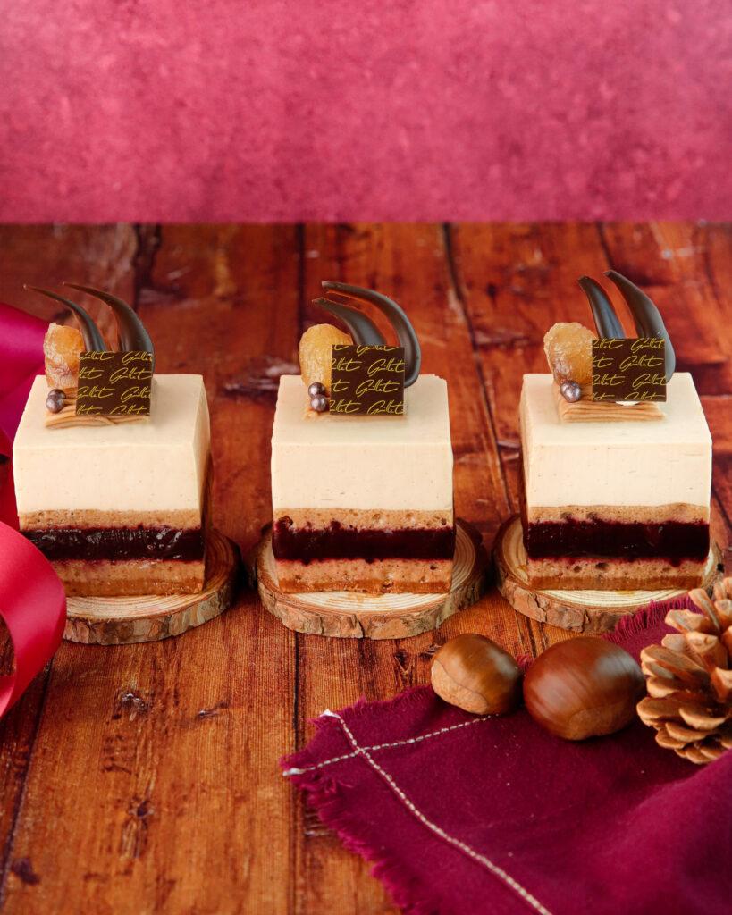 Sa mousse légère au marron dévoile une compotée cassis–myrtille acidulée, reposant sur un biscuit moelleux à la châtaigne. Le tout est soutenu par un croustillant au marron enrichi de crumble et ponctué de brisures croquantes, pour une dégustation tout en textures.