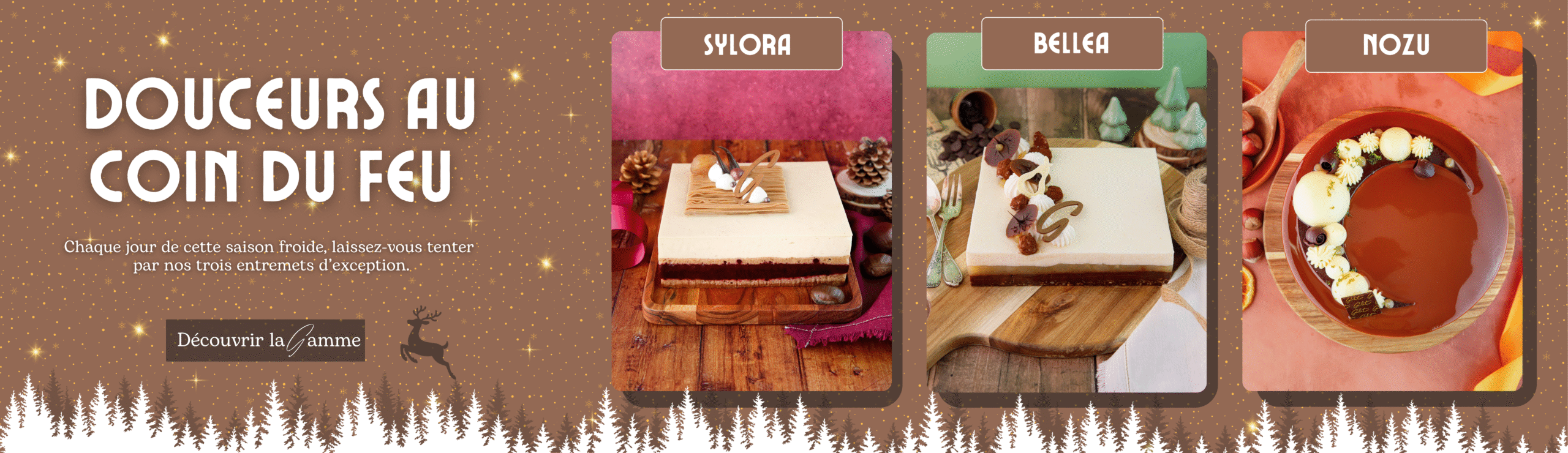 Cet hiver, notre collection se veut à la fois authentique, généreuse et pleine de tendresse. Trois entremets d’exception viennent célébrer cette période unique, chacun révélant une harmonie de textures fondantes, notes fruitées et parfums chocolatés.